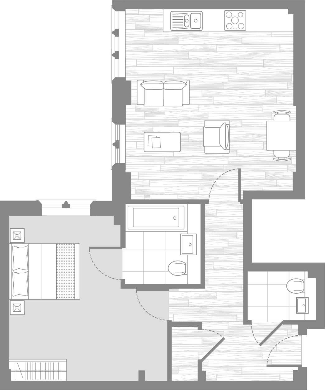 Step into this spacious one bedroom apartment at Crescent House, and you'll be greeted by 627 sq. ft. of living space. As you enter the property in the hallway, a convenient services cupboard housing the washer/dryer, and offering valuable yet hidden storage space. A W/C offers one of two washrooms, with the second being an en-suite bathroom adorned in black porcelain tiling, a white suite and chrome hardware. The bedroom boasts ample space, complete with a full-height fitted wardrobe and oatmeal carpet, whilst the open-plan kitchen, living and dining space features natural oak flooring, integrated appliances by Smeg, and a practical living space.